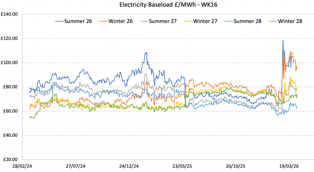 On 10 April 2026 report, day-ahead gas was 115 p/therm year-ahead gas was 117p/therm while day-ahead for power was £91/MWh, and year-ahead was £94/MWh